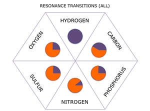 Fraction of resonance transitions of the basic bio-elements observed in the 90-320 nm spectral range.